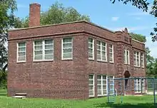 A flagpole is located outside the main entrance to the school building, and is included in the NRHP listing as a contributing feature. A set of gym bars, a tether ball pole, a swing set, a "slippery slide", and a merry-go-round are located on the south and west sides of the property, and are all listed as contributing features. A fenced tennis and basketball court is located on the north side of the property, and a large track and playing field are located on the west side of the property, but none of these features are included in the listing.[1]