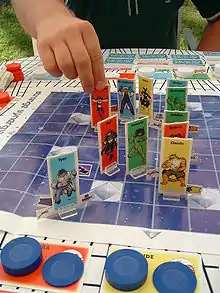 The game supports up to four players. However, there are bases and flags for two more players. Each player receives a team of three "Super Heroes" cards that all share a base special power (such as accelerated movement or higher damage). Each player then receives nine power cards which they will distribute evenly amongst their team. There are three main ways to win the game: kill all opposing team members, stun/freeze (neutralize) all enemies for three turns in a row, or capture an opposing team's flag.