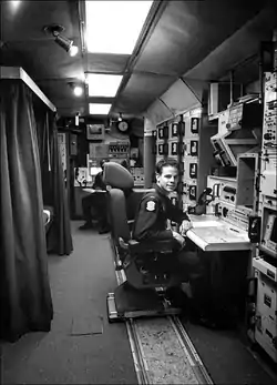 Command Data Buffer configuration in 1991, including part of the SACCS Replacement Keyboard (SRK), Line Printer Unit (LPU) and associated equipment rack (right edge of photo) in an underground missile launch facility. The 1983 "WarGames" movie scene in the ICBM launch center (filmed in a Missile Procedure Trainer at Vandenberg AFB) briefly shows a SACCS LCC mainframe computer inside the launch capsule. The SAC Control System circuits that terminated at the same Remote Communications Central (RCC) had diversified routing--circuits originating and terminating at common locations were routed via diverse paths.[1]