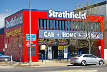 The name Strathfield is used for stores that carry the full range of products. Exteriors of these buildings are painted red. Smaller stores that mainly carry mobile phones and accessories and are often located in major shopping centres are branded Strathfield Connect. Strathfield is well known for its slogan and accompanying jingle Drive In and Jive Away.
