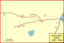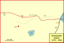 Strathpeffer was the largest community on the line of route, with a population of 2,247 in 1861.[5] Notwithstanding the deviation, it was given a station, although this was about two miles north of the town at the top of a steep hill. The line opened to goods traffic on 5 August 1870 and to passengers on 19 August 1870, and this Strathpeffer station opened at the same time. The line was worked by the Highland Railway. Sir William MacKenzie died before the line opened, and his heir was friendly towards railways.[2]