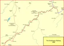 Inverness people travelling to the south resented the long deviation through Aberdeen, and they decided to build their own line to reach Perth, starting out from Forres on the Inverness and Aberdeen Junction Railway. This new southward line, constructed by the nominally independent Inverness and Perth Junction Railway, ran to Perth via Dava Moor, using the Perth and Dunkeld Railway and a section of the Scottish North Eastern Railway at the southern end. That project was authorised in 1861 and it opened throughout in 1863.[3] The building of this line had the potential to abstract a huge volume of traffic from the GNoSR route via Aberdeen. A report submitted to the GNoSR board claimed that "the value of through traffic between stations on the Inverness line and the south is apt to be over-rated", but their true belief was revealed when they prepared a Parliamentary Bill for a 33 mile continuation of the Keith and Dufftown Railway line down the River Spey as far as Grantown-on-Spey, which was on the proposed I&PJR line to Perth. It was noted that there were large forests owned by Lord Seafield, that might generate timber traffic.[2][4]