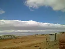 Stratocumulus volutus is a rare species of stratocumulus cloud, typically forming alone.[1] Volutus is translated from Latin, meaning revolve, being described as a roll cloud.[2][3] Stratocumulus volutus clouds are low-level clouds, forming below 2,000 meters (6,600 feet). Volutus clouds are much more common in the form of stratocumulus, as opposed to altocumulus volutus.[4] Stratocumulus volutus clouds are not severe, and may only bring several minutes of rain.[5] Alternatively, stratocumulus volutus clouds may form with numerous layers, contradicting the usual rounded form.[6]