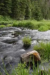 The first 8 miles (13 km) below Soldier Creek Dam is owned by the Bureau of Land Management, and is one of Utah's most productive brown and cutthroat trout fisheries, and was one of the first waters in Utah to be designated a Quality Fishing Stream.[3] This part of the river can only be accessed by a trail that runs along the north bank. No motorized vehicles are allowed.[4] 12 miles (19 km) below Soldier Creek Dam, the river runs by the Strawberry Pinnacles (sedimentary formations), where it is joined by the tributaries Avintaquin Creek and Red Creek. The narrow canyon the river runs through is characterized by high cliffs and dense foliage.