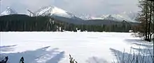 Štrbské pleso is now part of the neighborhood of Štrbské Pleso (spelled with a capital P). It is on the municipal lands of the village of Štrba, after which Štrbské pleso ("Lake Štrba") is now named. The word pleso ("tarn") is applied only to mountain lakes. The locals used to call it "the puddle" or "pond" (mláka) in the past.[1] It is the second-largest glacial lake on the Slovak side of the High Tatras, after Hincovo Pleso, to which it loses by 0.8 acres (3,200 m2).[2] It is fed by underground springs and has no visible outflow stream. Its surface remains frozen for around 155 days per year.[3]
