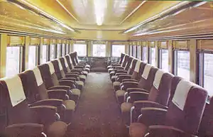 By March 1950 all three sets were in operation. The other two, the Fort Crevecoeur and Mound City, were on the St. Louis–Peoria route as originally planned. All three trains offered parlor and "À la carte" dining service. The two streamliners made the trip in 4 hours 40 minutes, forty minutes faster than conventional interurbans on the route.[8] Poor patronage led the Illinois Terminal to withdraw the City of Decatur in August 1950; the equipment was reassigned to the Peoria run.[9] The new service was named Sangamon, which was the railroad's original choice in 1947.[5][10]