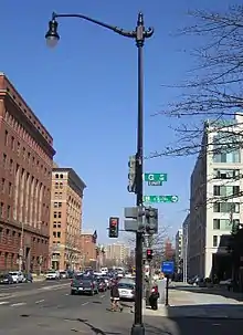 Under federal law and DDOT regulations, streets in the District of Columbia are classified as historic or non-historic. Historic streets are required to use the more decorative poles, while non-historic streets may use the less decorative ones. All streets are required to maintain uniformity and consistency in the use and placement of lampposts.[53] Historic streets with underground power lines may use the black Upright 14, 16, or 18 pole.[54] Historic streets with above-ground power lines may use the black Decorative Teardrop pole.[55]