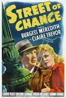 Street of Chance is a 1942 American film noir mystery film directed by Jack Hively and starring Burgess Meredith as a man who finds he has been suffering from amnesia and Claire Trevor as a woman who protects him from the police, who suspect him of murder. He is suspected of the murder of the wealthy Harry Diedrich. The only eyewitness to the murder was Harry's mute grandmother, and she can only communicate with others through sign language.