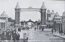 The Dufferin Gates are the westernmost pedestrian entranceway to the CNE grounds. Named after Lord Dufferin, the original gate to the CNE grounds was named in his honour, situated at the bottom of Dufferin Street, also named after the same person. The original gateway was erected in 1895 and was superseded by a more permanent, ornate Beaux-Arts style triumphal arch built in 1910, and officially re-opened by Lord Dufferin in 1914.