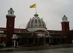 In 1902, after the Government of Canada announced it would sponsor a major exhibition at the site in 1903, the Toronto City Council decided to rebuild the exhibition site. In 1903, the Government of Canada reached an agreement to transfer the remaining military reserve to the City of Toronto. Under the agreement, military uses were permitted to continue until such time that replacement facilities were built. Included in this was Old Fort York, which the City committed to preserve.[6] The building campaign saw the building of fifteen permanent buildings designed by architect G. W. Gouinlock from 1903 until 1912, including the surviving Press Building, Horticulture Building, Government Building, Music Building and Fire Hall / Police Station. The new buildings were elaborately designed and set in an attractively landscaped site. At the conclusion of the building campaign, the name was officially changed to the Canadian National Exhibition. The five remaining buildings were declared a historic site in 1988.[7]
