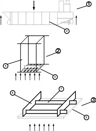 The secondary hull loads, bending, and strength are those loads that happen to the skin structure of the ship (sides, bottom, deck) between major lengthwise subdivisions or bulkheads. For these loads, we are interested in how this shorter section behaves as an integrated beam, under the local forces of displaced water pushing back on the hull, cargo and hull and machinery weights, etc. Unlike primary loads, secondary loads are treated as applying to a complex composite panel, supported at the sides, rather than as a simple beam.