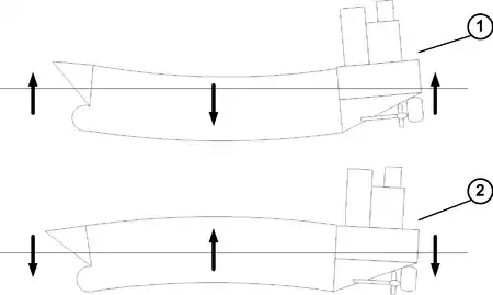 - sagging, due to a wave with length equal to the ship's length, and peaks at the bow and stern and a trough amidships