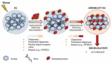 Stress granule formation is often downstream of the stress-activated phosphorylation of eukaryotic translation initiation factor eIF2α; this does not hold true for all types of stressors that induce stress granules,[17] for instance, eIF4A inhibition. Further downstream, prion-like aggregation of the protein TIA-1 promotes the formation of stress granules. The term prion-like is used because aggregation of TIA-1 is concentration dependent, inhibited by chaperones, and because the aggregates are resistant to proteases.[18] It has also been proposed that microtubules play a role in the formation of stress granules, perhaps by transporting granule components. This hypothesis is based on the fact that disruption of microtubules with the chemical nocodazole blocks the appearance of the granules.[19] Furthermore, many signaling molecules have been shown to regulate the formation or dynamics of stress granules; these include the "master energy sensor" AMP-activated protein kinase (AMPK),[20] the O-GlcNAc transferase enzyme (OGT),[21] and the pro-apoptotic kinase ROCK1.[22]
