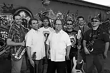 After Stretch Armstrong's breakup, Van Wagenen, South, Nelson, and Acomb joined a few other musicians to form the Moxie Tonic Medicine Show.[2] The 10-piece big band incorporated variety show acts into their performances. [59] Jessica Christiansen and Lucy Campbell described them as "Salt Lake's best swing show" when they opened for The Cherry Poppin' Daddies in 1998.[60]
