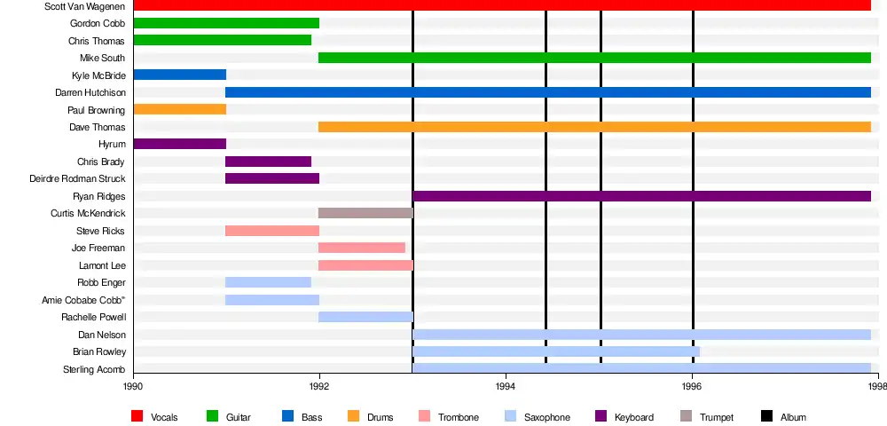 Data for this timeline come from the Stretch Armstrong Facebook page.[57] Credits for individual albums come from the credits sections of those albums.[58][23][40][41]