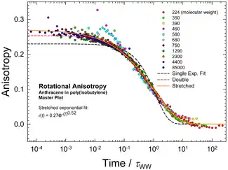 In physics, the stretched exponential function is often used as a phenomenological description of relaxation in disordered systems. It was first introduced by Rudolf Kohlrausch in 1854 to describe the discharge of a capacitor;[1] thus it is also known as the Kohlrausch function. In 1970, G. Williams and D.C. Watts used the Fourier transform of the stretched exponential to describe dielectric spectra of polymers;[2] in this context, the stretched exponential or its Fourier transform are also called the Kohlrausch–Williams–Watts (KWW) function.