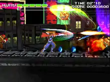 While the graphics in Strider 2 now consist of 2D character sprites overlaid over 3D backgrounds, its gameplay remains similar to its 2D side-scrolling predecessor. The controls consists of an eight-way joystick and three action buttons. The playable character Strider Hiryu can now perform new actions in addition to the ones he had in the first game. Hiryu can walk, jump, crouch, slide, and climb walls and ceilings like he would in the original game, as well as dash by pushing the joystick left or right twice, do a double jump by pressing jump in mid-air, and do a backward somersault jump while sliding. When climbing a wall, Hiryu can perform a thrust jump by holding the joystick away from the wall and pressing the Jump button. Added to his regular sword attack, Hiryu can now do a "Savage Slash" technique in mid-air by pressing the joystick down and up in mid-air. In addition to the Attack and Jump buttons, the player can power-up their character by pressing the "Boost" button if they have at least one Boost item in stock. While in Boost mode, Hiryu can shoot Plasma Waves with his sword for a limited period until the Boost gauge under Hiryu's life gauge runs out. Throughout the game, the player can pick up power-up items such as health replenishments and extensions, a cypher extension, and additional boosts. The player can obtain various miscellaneous point items based on other Capcom games, such as the Yashichi and the Sakichi symbols from Vulgus and the "zenny" coins from Black Tiger and Forgotten Worlds, that will increase the player's score.[2]