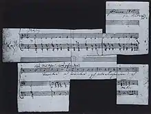 Schubert wrote the D minor quartet in March 1824,[10] within weeks of completing the A minor Rosamunde quartet. He apparently planned to publish a three-set volume of quartets; but the Rosamunde was published within a year, while the D minor quartet was only published in 1831, three years after Schubert's death, by Diabelli.[11] It was first played in January 1826 at the Vienna home of Karl and Franz Hacker, amateur violinists, apparently with Schubert on the viola.[12]