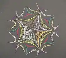 String art has its origins in the 'curve stitch' activities invented by Mary Everest Boole at the end of the 19th century to make mathematical ideas more accessible to children.[1] It was popularised as a decorative craft in the late 1960s through kits and books.[2]