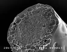 Nylon is the most popular string material for amateur players due to its low cost and the improvement in elasticity offered by multi-filament strings.[10] Wear-resistant coatings for nylon strings are common, especially with multi-filament strings, because the outer filaments tend to break first as the racquet is used.[11]