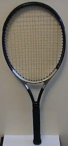 In tennis, the strings are the part of a tennis racquet which make contact with the ball. The strings form a woven network inside the head (or "hoop") of the racquet. Strings have been made with a variety of materials and possess varying properties that have been measured, such as dynamic stiffness, tension retention, thickness (gauge), string texture (shape of the string), and rebound efficiency.[1]