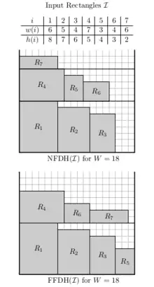 Let be the given set of rectangular items. First, the algorithm sorts the items by order of nonincreasing height. Then, starting at position , the algorithm places the items next to each other in the strip until the next item will overlap the right border of the strip. At this point, the algorithm defines a new level at the top of the tallest item in the current level and places the items next to each other in this new level.