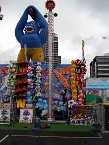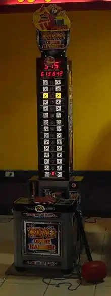 A high striker, also known as a strength tester, or strongman game, is an attraction used in funfairs, amusement parks, fundraisers, and carnivals. It operates by utilizing the lever where one end holds a puck attached to the tower and the other end is struck by the person or contestant using a hammer or mallet. The aim of players is to ring the bell suspended on top of the tower. If the lever is struck with enough force, the puck will rise high enough to hit the bell, indicating a success. Modern versions use a spring-loaded version of the lever, others use an enclosed striking mechanism.