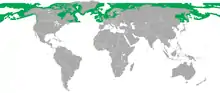 Strongylocentrotus droebachiensis is commonly known as the green sea urchin because of its characteristic green color. It is commonly found in northern waters all around the world including both the Pacific and Atlantic Oceans to a northerly latitude of 81 degrees and as far south as Maine[1] (in the U.S.) and England. The average adult size is around 50 mm (2 in), but it has been recorded at a diameter of 87 mm (3.4 in). The green sea urchin prefers to eat seaweeds but will eat other organisms. They are eaten by a variety of predators, including sea stars, crabs, large fish, mammals, birds, and humans. The species name "droebachiensis" is derived from the name of the town Drøbak in Norway.[2]