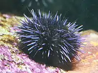 Strongylocentrotus purpuratus, the purple sea urchin, lives along the eastern edge of the Pacific Ocean extending from Ensenada, Mexico, to British Columbia, Canada.[1] This sea urchin species is deep purple in color, and lives in lower inter-tidal and nearshore sub-tidal communities. Its eggs are orange when secreted in water.[2] January, February, and March function as the typical active reproductive months for the species. Sexual maturity is reached around two years.[3] It normally grows to a diameter of about 10 cm (4 inches) and may live as long as 70 years.[4]
