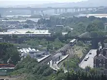 Although Strood station was the property of the SER, the Toomer Loop, together with the stations at Rochester and Chatham, was LCDR property. A second junction at Strood was bought into use on 20 July 1891, when the first section of the Rochester & Chatham Extension was opened, by which SER trains reached their own stations at Rochester and, from 1 March 1892, Chatham.[7] This line was to the north-east of, and largely ran parallel to, the LCDR line; it had its own bridge over the Medway. On 1 January 1899 the SER and LCDR entered into a working union which traded as the South Eastern & Chatham Railway (SE&CR) and set about eliminating duplicated facilities.[8] In 1911, a connecting line was put in between the SER and LCDR on the south-eastern side of the SER's Rochester Bridge; this allowed trains from Strood to reach the LCDR stations at Rochester and Chatham from October 1911.[9] In 1927 (after the SER & LCDR had merged with other railways to form the Southern Railway), another connecting line was put in between the former SER and LCDR routes on the north-eastern side of the SER's Rochester Bridge; this enabled the LCDR's bridge to be taken out of use.[10]