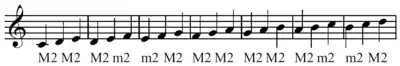 E and C are three notes apart, C and D are two notes apart, D and E two notes apart. Just as the distance around the circle of fifths between forms the interval pattern 3-2-2, M2-M2 occurs three times, M2-m2 occurs twice, and m2-M2 occurs twice.