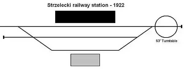 Strzelecki was the only station on the line to be fitted with a 53' turntable. Gangers facilities at the station were the ganger's headquarters, tool shed and departmental residence. Goods facilities at the station included goods loading platform, goods shed and cattle and sheep yards. Motor gang trolleys were also kept at the station.