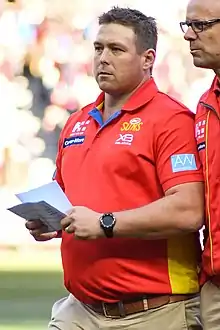 Stuart Dew (born 18 August 1979) is an Australian rules football coach and former player who is currently the head coach of the Gold Coast Suns in the Australian Football League (AFL). As a player he played for the Port Adelaide Football Club and Hawthorn Football Club in the Australian Football League.[1] Dew was acknowledged as being a long penetrating left foot kick of the football.[2]
