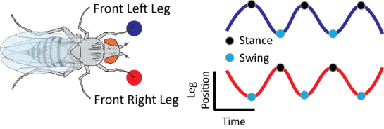 Many animals alter walking kinematics as they modulate walking speed.[11][12][13] An interlimb kinematic parameter that is commonly speed dependent is gait, the stepping pattern across legs. While some animals alternate between distinct gaits as a function of speed,[14] others move along a continuum of gaits.[15] Similarly, animals commonly modulate intralimb parameters across speed. For example, fruit flies decrease stance duration and increase step length as forward speed increases.[16] Importantly, kinematics are not only modulated across forward velocity, but also rotational and sideslip velocities.[17] In these cases, asymmetry in the modulation between left and right legs is common.