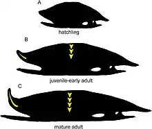 Prior to the 2021 study of Cadena and colleagues, only adult specimens of Stupendemys had been described. The discovery of a specimen with a carapace length smaller than 1 meter gives an insight into the changes the animal undergoes while reaching maturity. In addition to its small size, the animal is identified as a juvenile to young adult based on the absence of large horns and shallow anal notch. The inner nuchal notch, anterior expansion of the peripherals 1 and 2, irregular nodular contours, inner contact between the 7th and 8th costals and the relative size of the plastral lobes and their arrangement (except for the pectorals) remains relatively consistent with size.[4]