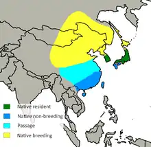 The breeding range covers central and north-east China, Korea, Japan and south-east Siberia. In winter, birds from colder regions migrate south to southern and eastern China, South Korea, southern Japan, Taiwan and northern Vietnam with vagrants reaching the Philippines, Thailand and Myanmar. There is a record from Homer, Alaska in 1998 which probably arrived with a ship (West 2002).