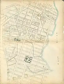 The property was inherited in Stuyvesant family, sometimes with new land acquisitions.[9][10] The family continued to hold slaves into the early 19th century.[11] The family land area gradually declined into the 19th century as pieces were sold off, both commercially and in some cases to local institutions for a nominal price. The tract of land that comprised Stuyvesant Farm covered what is today's East Village and Stuyvesant Town.[12]