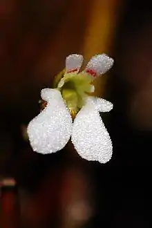 It is an ephemeral annual that grows from 1.5 to 4 cm tall. It bears white flowers with undivided posterior corolla petals that bloom from September to November in its native range. Its habitat has been reported as being sand to clay soils in winter-wet depressions near granitic rocks. S. perpusillum is a tropical species endemic to southwestern, Western Australia and is considered to be the smallest species in the genus Stylidium.[1][2] Johannes Mildbraed, in his 1908 monograph on the family, described S. perpusillum as also being present in Victoria and Tasmania, but all other collections since have only been in Western Australia.[3]