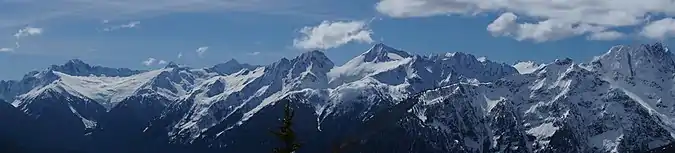 During the Pleistocene period dating back over two million years ago, glaciation advancing and retreating repeatedly scoured the landscape leaving deposits of rock debris.[5] The "U"-shaped cross section of the river valleys are a result of recent glaciation. Uplift and faulting in combination with glaciation have been the dominant processes which have created the tall peaks and deep valleys of the North Cascades area.