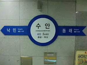 Suan Station (Korean: 수안역; Hanja: 壽安驛) is a station of Busan Metro Line 4 in Suan-dong, Dongnae District, Busan, South Korea.
