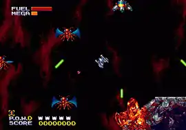 The ship is equipped with a force field and will explode if it sustains too much enemy damage.[5] It also has a limited supply of fuel and must be constantly recharged by collecting fuel canisters which are strategically placed throughout the levels, requiring players to plan when and where to refuel.[11] There are various other elements that make it easier for the player to be able to finish without running out of fuel. Mining rails are suspended throughout many levels allowing players to freely slide along them while shooting. Attaching the ship on the rails turns off fuel consumption and nullifies the effects of gravity which can make for easier targeting against bosses and barriers.[4] Scattered across the game's levels the players can find missile canisters (which equip the ship with secondary weapons), shield upgrades (which replenish the ship's force field), extra lives and various types of special equipment. When the "Mega" bar is fully-charged, the ship can also unleash a powerful multi-directional laser blast. Once used, the bar gets depleted and begins to recharge automatically.[12][9][11]