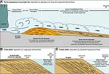 Subaqueous fan deposits are generally described as coarse to fine gravel and/or sand, with variable texture and sorting. Underflows (meltwater denser than lake water) tends to produce subaqueous fans with channels and levees.[3] Subaqueous fans can be formed by the influence of glacier movement and by underwater currents typically found at a river delta. The sediment size and composition that makes up the subaqueous fan is dependent on the type of rock that the water flow or glacial ice sheet moves over. Sedimentary structures found in subaqueous fans are heavily dependent on the strength of the water flow.[4]