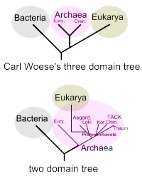 - The eocyte hypothesis, proposed by Lake et al. (1984),[14] which posits two domains: Bacteria and Archaea, with Eukaryota included as a subordinate clade branching from Archaea.[15][14][16]