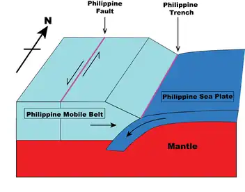 The region is bounded by subduction zones, where surrounding oceanic plates to the east and west slide towards the centre of the Philippine archipelago.[3][2] Subduction results in deep oceanic trenches, such as the Philippine Trench and Manila Trench, which bound the eastern and western sides of the Philippine archipelago, respectively.[4] The Philippine archipelago is also cut along its length by a left-lateral strike-slip fault known as the Philippine Fault.[5][1]