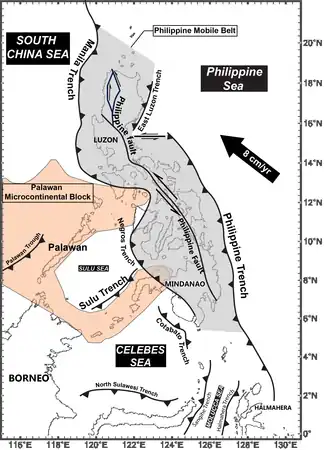 The Philippine Mobile Belt is bounded by convergence zones of different polarities: east-dipping subduction at the Manila Trench, Negros Trench, Sulu Trench, and Cotabato Trench to the west; and west-dipping subduction at the Philippine Trench and East Luzon Trough along its eastern boundary.[3][12][13] The belt is tectonically separated from surrounding plates, and thus regarded as an "independent block" or "microplate" in the Philippines.[6][14] Regardless of the uncoupling with surrounding tectonic units, the Philippine Mobile Belt has an affinity to both the Eurasian Plate and the Philippine Sea Plate.[15][3] It contains volcanic arc materials from the Philippine Sea Plate, as well as crustal materials from the Eurasian Plate.[9] It is very difficult to define a clear tectonic boundary as much information along the Philippine Mobile Belt is swept away by the Philippine Fault, a strike-slip fault traversing the mobile belt.[9]