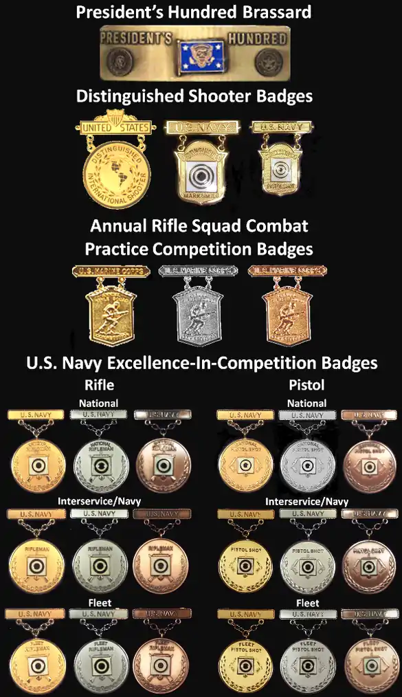 The U.S. Navy also has Marksmanship Competition Badges that are authorized for wear on Navy service uniforms for those sailors and officers who earn them. These badges are awarded by the Navy to sailors and officers upon receipt of official scores, known as "leg points", earned at an authorized Civilian Marksmanship Program (CMP) competition. In addition, sailors can earn and wear the President's Hundred Brassard when finishing in the top 100 competitors of the President's Hundred Match. Also, sailors can earn and wear the U.S. Marine Corps's Annual Rifle Squad Combat Practice Competition Badge when competing as part of a Marine Rifle Squad—this badge is typically awarded to Navy Corpsman assigned to Marine infantry units. The following Marksmanship Competition Badges are currently awarded and authorized by the U.S. Navy (in order of precedence):[21]