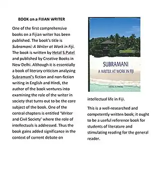 - Patel, Hetal. Subramani: A Writer at Work in Fiji. New Delhi: Creative Books, 2014. ISBN 978-81-8043-112-8 OCLC 904714205
