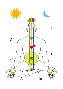 Subtle body concepts and practices can be identified as early as 2nd century BCE in Taoist texts found in the Mawangdui tombs.[1] It was "evidently present"[1] in Indian thought as early as the 4th to 1st century BCE when the Taittiriya Upanishad described the Panchakoshas, a series of five interpenetrating sheaths of the body.[2] A fully formed subtle body theory did not develop in India until the tantric movement that affected all its religions in the Middle Ages.[1] In Indo-Tibetan Buddhism, the correlation of the subtle body to the physical body is viewed differently according to school, lineage and scholar, but for completion stage in yoga, it is visualised within the body.[3] The subtle body consists of focal points, often called chakras, connected by channels, often called nadis, that convey subtle breath, often called prana. Through breathing and other exercises, a practitioner may direct the subtle breath to achieve supernormal powers, immortality, or liberation.