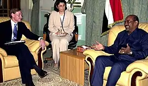 Before the 2000 presidential election, al-Turabi introduced a bill to reduce the President's powers, prompting al-Bashir to order a dissolution and declare a state of emergency. When al-Turabi urged a boycott of the President's re-election campaign signing agreement with Sudan People's Liberation Army, al-Bashir suspected they were plotting to overthrow the government.[118] Hassan al-Turabi was jailed later the same year.[119]