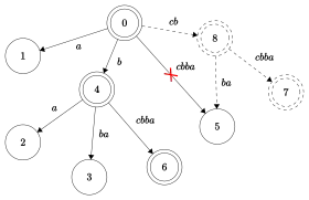 - Transitions that have led to before but corresponded to words of the length at most are redirected to . To do this, one continues going through the suffix path of until the state is found such that transition by from it doesn't lead to .
